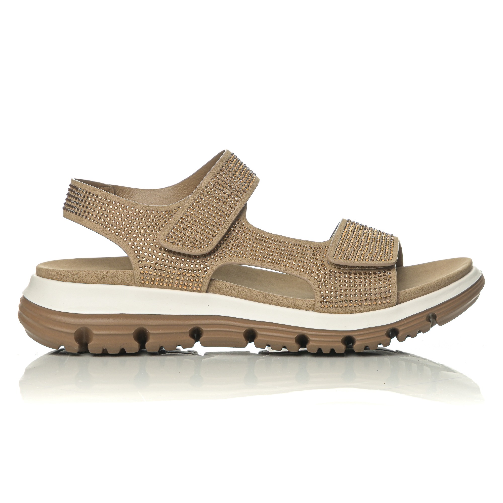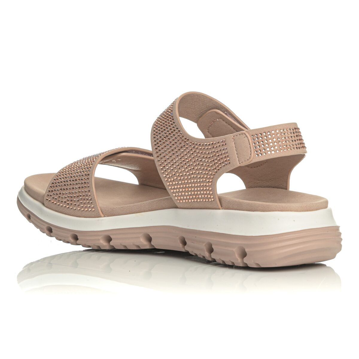 Αναβαθμίστε τις καλοκαιρινές σας εμφανίσεις με αυτό το γυναικείο σανδάλι που συνδυάζει άνεση και κομψή λάμψη. Διακοσμημένο με εντυπωσιακά strass σε όλη την επιφάνεια, χαρίζει glam χαρακτήρα ακόμη και στα πιο απλά outfits.