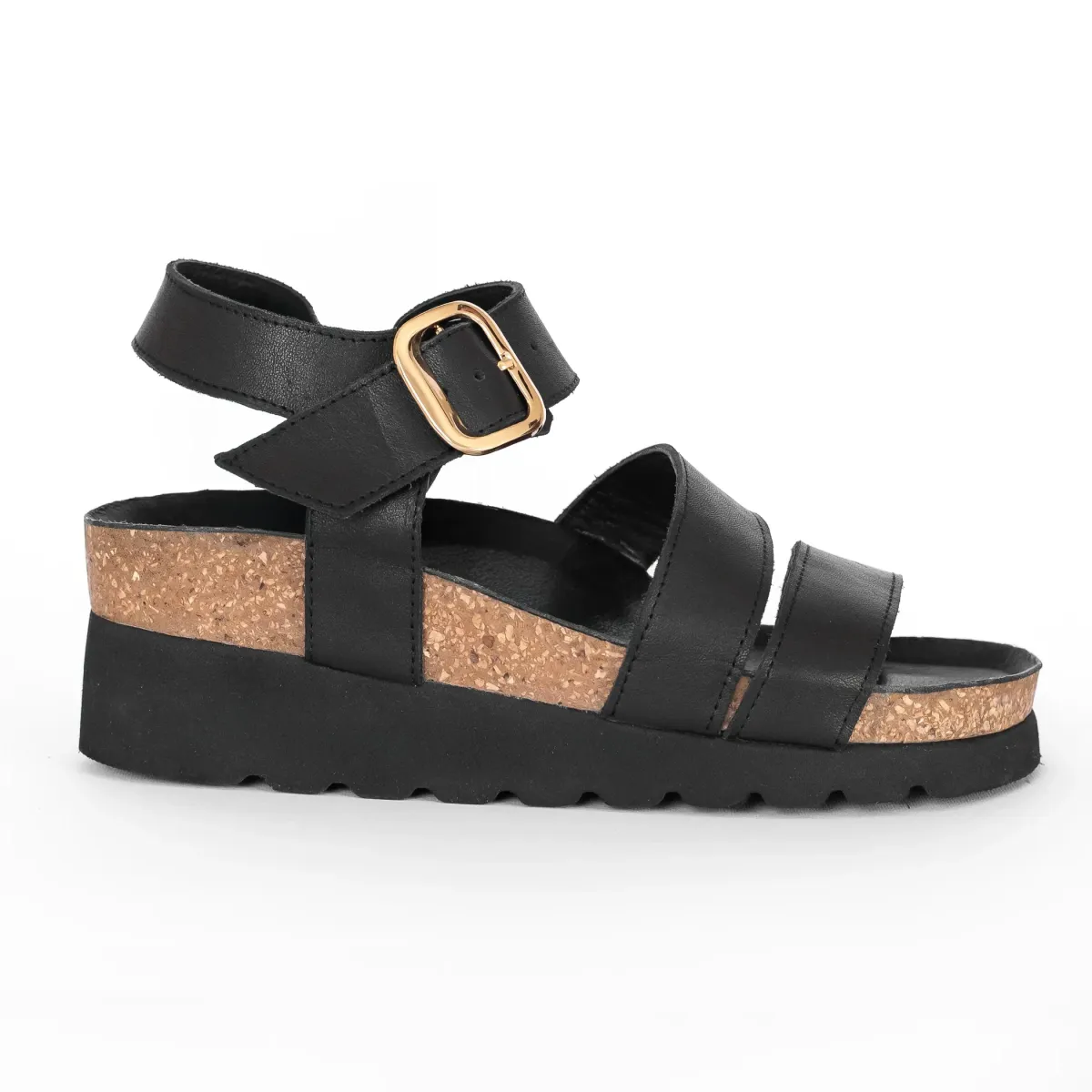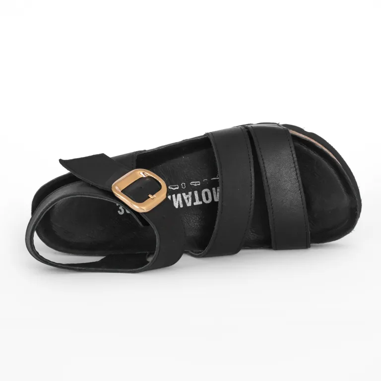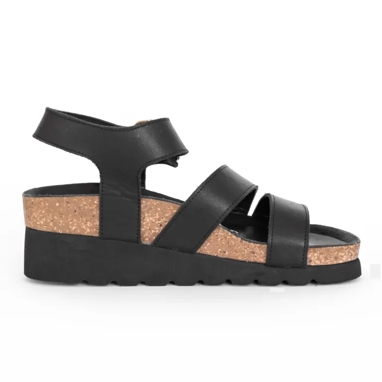Γυναικεία, ανατομικά, εξ ολοκλήρου δερμάτινα πέδιλα σε μαύρο χρώμα. Ο πάτος τους είναι ανατομικός, μαλακός, δερμάτινος και διαμορφωμένος με τέτοιο τρόπο ώστε να προσδίδει στο πόδι την ορθή κλίση και τις κατάλληλες καμπύλες. Παράλληλα, διαθέτουν στο ανατομικό πέλμα τους αφρώδη υλικά κι ειδικό gel ενίσχυσης, το οποίο προσφέρει στο υπόδημα τη δυνατότητα να ξεκουράζει το πόδι, καθιστώντας τη χρήση του πιο άνετη κι αναπαυτική.  Η σόλα είναι κατασκευασμένη από φυσικό φελλό απορροφώντας έτσι τους κραδασμούς που δημιουργούνται κατά το περπάτημα ενώ παράλληλα παρέχει αντιολισθητική προστασία προσφέροντας ένα ασφαλές και σταθερό περπάτημα. Η φόρμα τους είναι κανονική. Το ύψος της σόλας είναι 6,5 εκ.