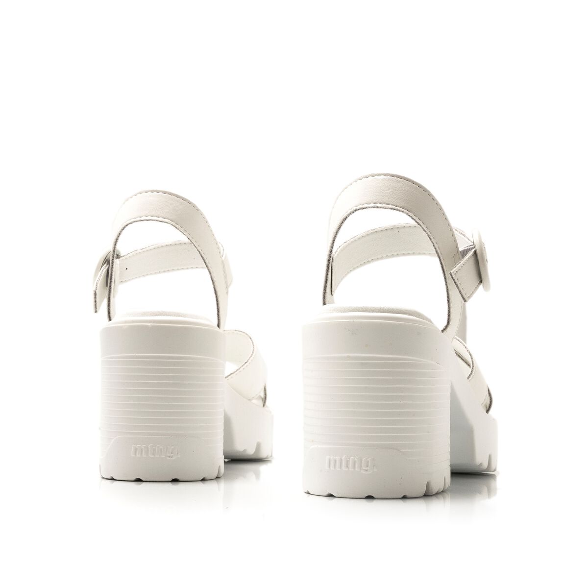 Saba mtng πέδιλο με τακούνι για νεαρά κορίτσια. Φτιαγμένο σε λευκο χρώμα, έχει λουράκι που περιβάλλει τον αστράγαλο φινιρισμένο με πόρπη και δύο σταυρωτές τιράντες στο πίσω μέρος.