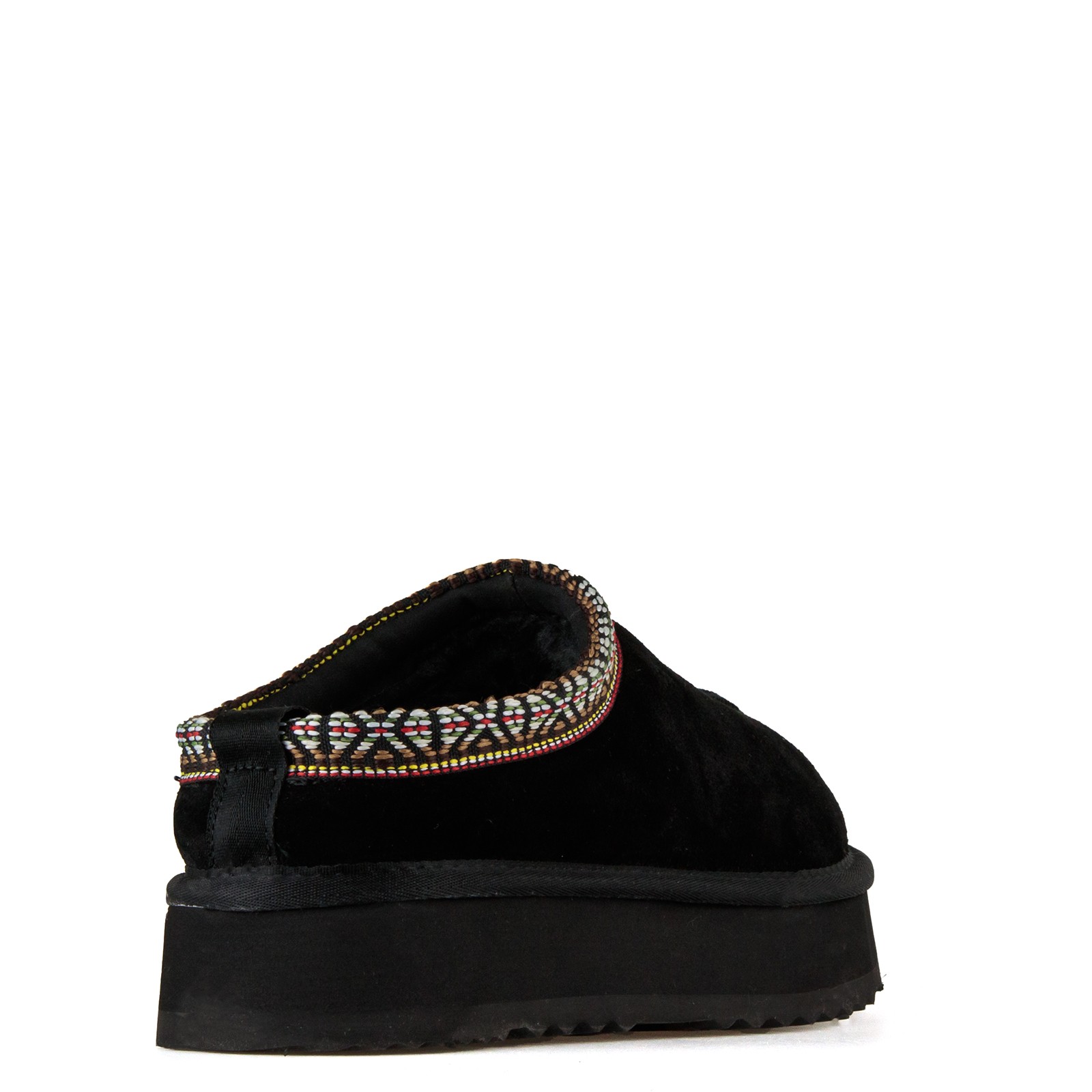 Μαύρη δερμάτινη παντόφλα με γούνα και λεπτομέρεια boho από τη Kelara.