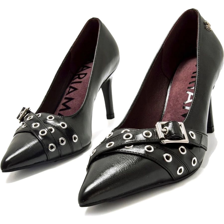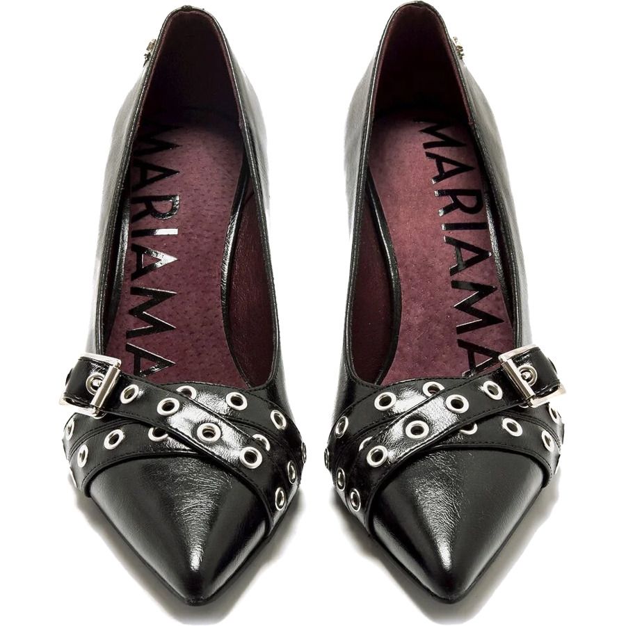 Μαύρη γόβα με χιαστί λουράκια στο μπροστινό μέρος, τρουκς και διακοσμητική ασημένια αγκράφα από τη MariaMare.