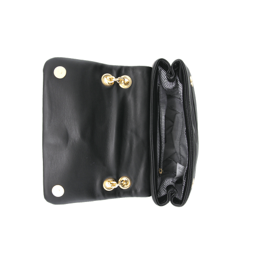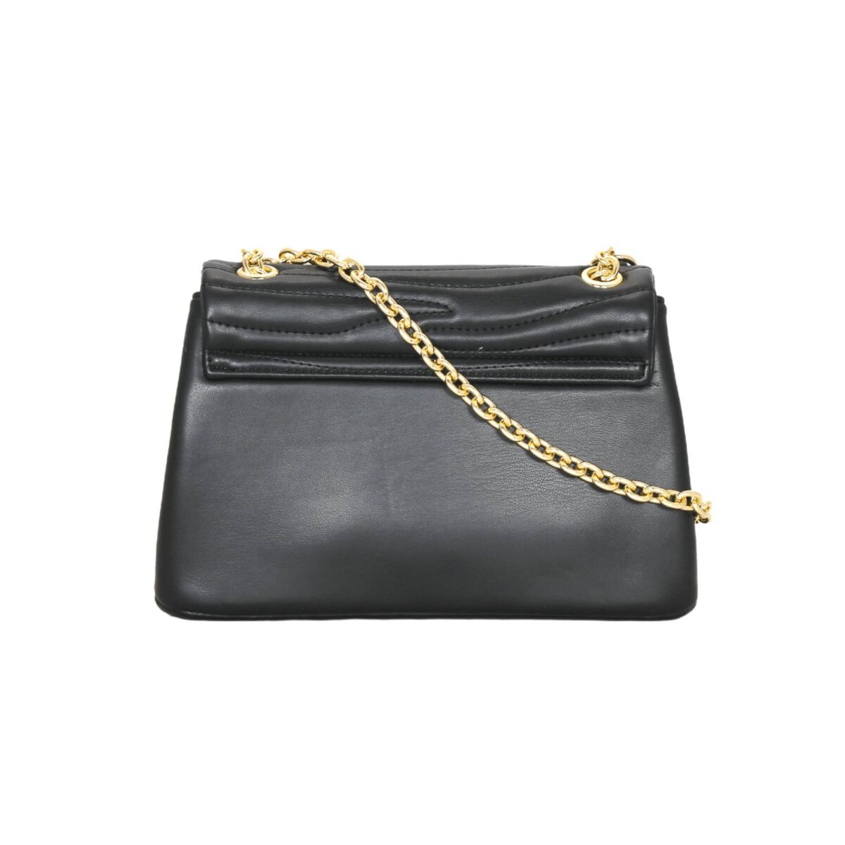Μαύρη γυναικεία τσάντα χιαστί από την Mariamare, μοντέλο Shana με καπάκι και καπιτονέ σχέδιο. Η κυματιστή υφή της και το χρυσό μεταλλικό λογότυπο στο μπροστινό μέρος προσθέτουν μια μοντέρνα και ελκυστική οπτική λεπτομέρεια. Περιλαμβάνει χρυσή λαβή με αλυσίδα με επενδεδυμένο τμήμα για επιπλέον άνεση και μαγνητικό κλείσιμο με καπάκι. Το εσωτερικό είναι επενδεδυμένο και διαθέτει τσέπη με φερμουάρ για μικρά αντικείμενα. Μια ευέλικτη επιλογή με προσωπικότητα που συνδυάζει λειτουργικότητα με σύγχρονο σχεδιασμό.
