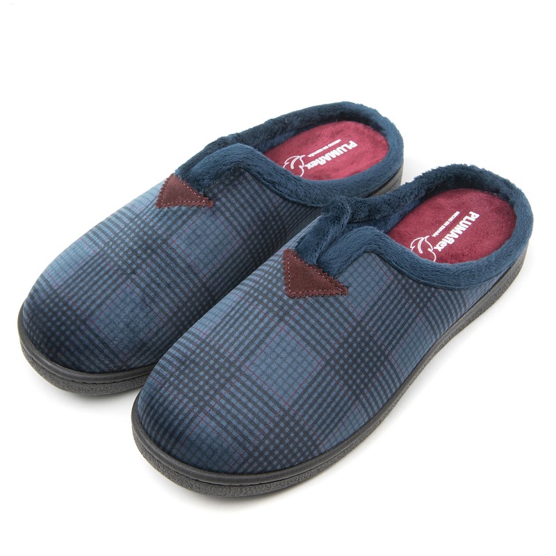 Ανδρική παντόφλα Roal σε σκούρο μπλε χρώμα με απαλό, ανάγλυφο γούνινο τελείωμα. Κατασκευασμένη στην Ισπανία από ύφασμα υψηλής ποιότητας. Διαθέτει τονικές ρίγες και μυτερό άνοιγμα στο πάνω μέρος για καλύτερη εφαρμογή και διαμόρφωση των δακτύλων. Περιλαμβάνει αφαιρούμενη, μπορντό εσωτερική σόλα Plumaflex από αναπνεύσιμο, υψηλής ανθεκτικότητας αφρό PU με ανάγλυφο το λογότυπο της μάρκας τόσο στο πάνω μέρος όσο και στο πάνω μέρος.